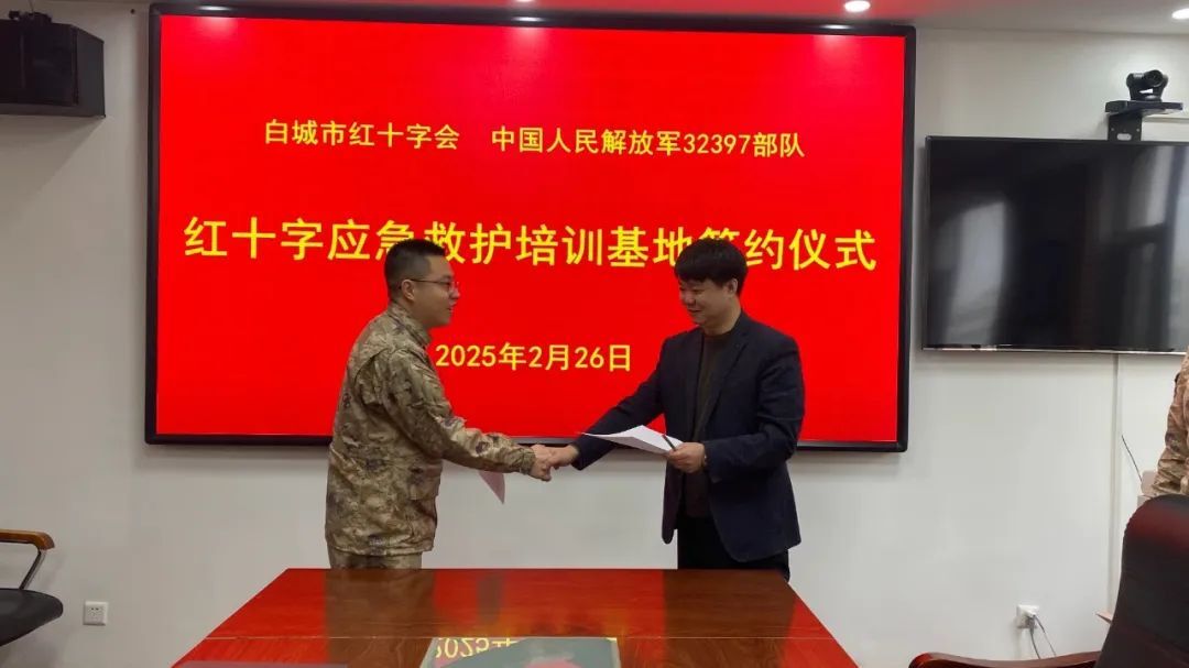为深入贯彻落实中央军委后勤保障部、中国红十字总会关于推动红十字会事业军民一体化发展的有关要求,2月26日,白城市红十字会与中国人民解放军32397部队举行成立白城市红十字应急救护培训基地签约仪式,市红十字会专职副会长刘贺、32397部队卫勤处处长黄剑秋及有关部门负责同志参加此次活动。双方共同表示,应急救护培训基地的成立是白城市深入落实军民一体化发展的具体举措;是深化军民融合,为民造福的实际行动;是为新时代国防和军队建设贡献红十字力量的有力实践。下一步,双方将围绕“应急救护培训进军营”活动,推动“三献”工作方面的深化合作。