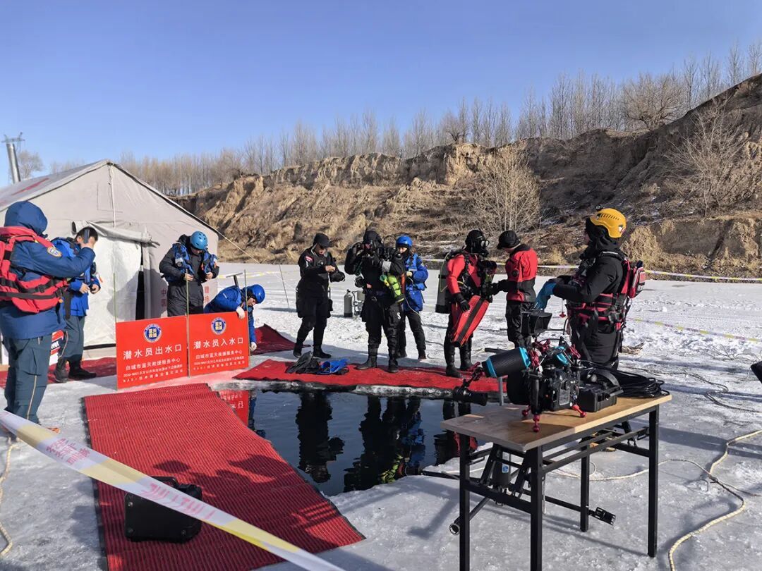 演练筹备阶段,组委会依据冰潜潜水专项计划,先后完成场地踏查、冰面厚度检测及风险评估,科学划分热身区、入水区、作业区及安全观察区,明确各区域安全负责人。同时搭建防寒保暖“暖心基地”,配备供热设备、应急热饮及备用防护装备,此外,救援队员还对冰域救援器材进行全面气密性检测与通讯设备调试,确保演练安全有序开展。