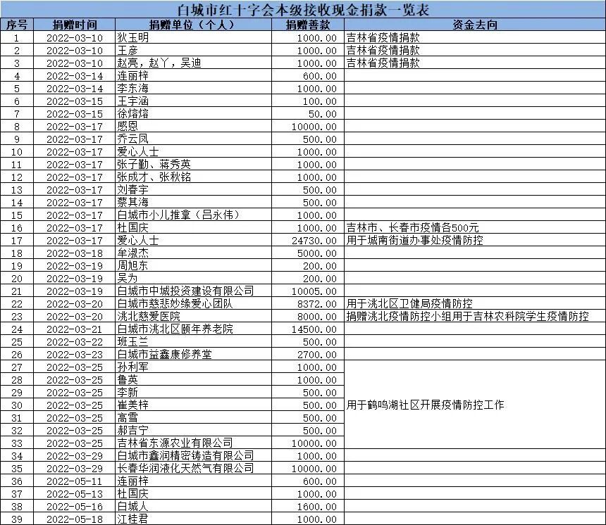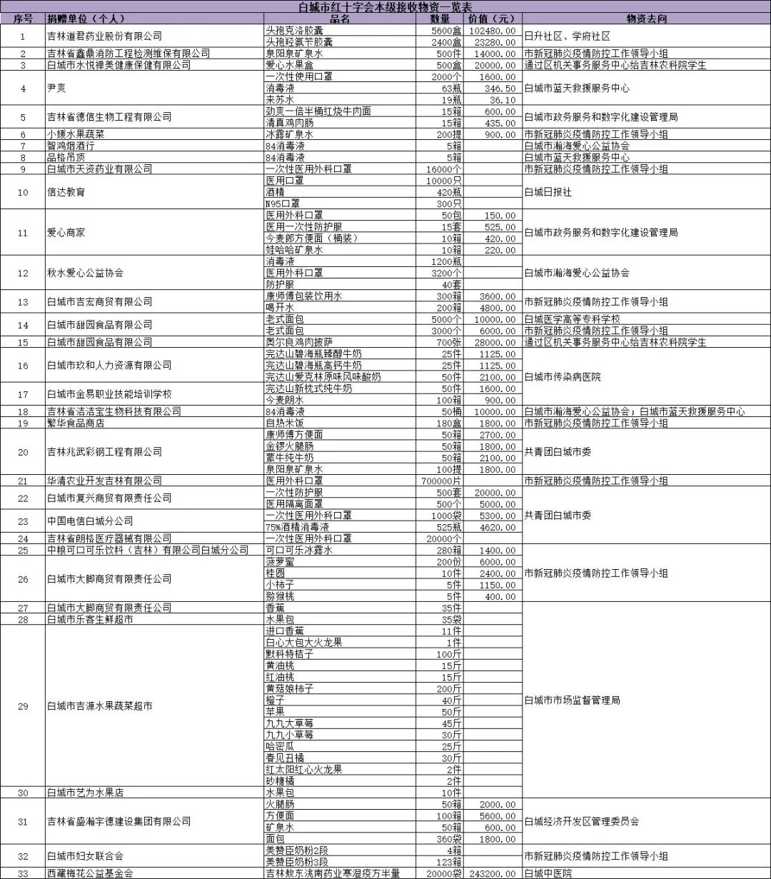 白城市红十字会疫情防控接收社会捐赠款物公示(十四)