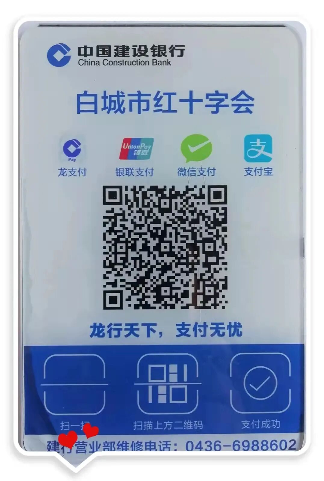 请捐款人可通过银联、支付宝、微信等方式扫描下方二维码进行捐款。