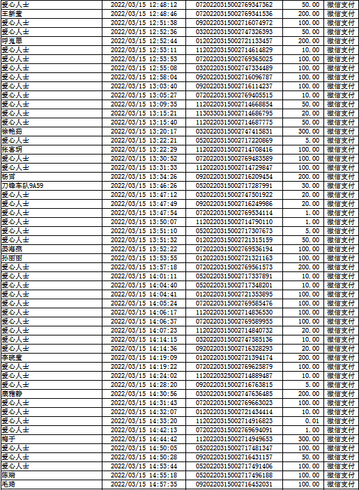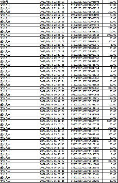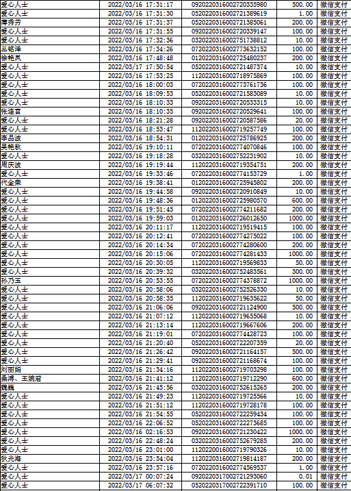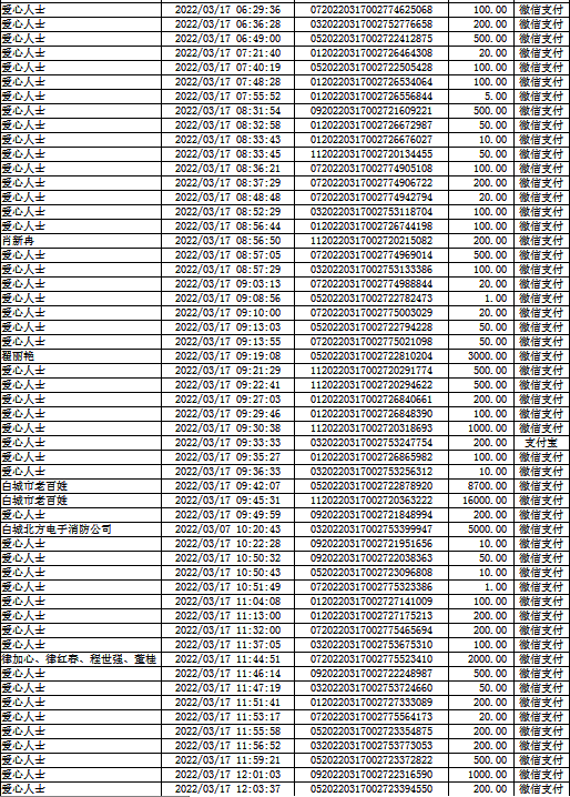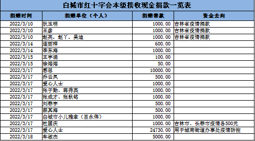 截止2022年3月17日24时,白城市红十字会接收捐赠款物40.696226万元,其中接收捐赠资金24.286966万元,支出捐赠资金合计1.93万元,定向捐赠汇往吉林省红十字会支出1.9万元、汇往白城市蓝天救援服务中心0.03万元;接收捐赠物资消毒液、来苏水、口罩、头孢、水果、矿泉水、方便面、火腿肠等物资按照捐赠方意向都已全部支出,其余捐赠资金将统一按照白城市新冠肺炎疫情防控工作领导小组安排进行分配。