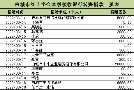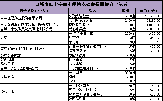 白城市红十字会疫情防控接收社会捐赠款物公示(一)