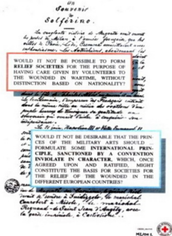 1859年,奥地利和法国在意大利北部一个名叫索尔弗利诺的地方展开激战,双方伤亡惨重,因缺乏医疗救护,4万多死伤士兵被遗弃在战场上,尸横遍野,血流成河。亨利·杜南因生意而途经此地,为惨象所震惊,当即投入战场救护。他联系当地一所教堂作为临时救护所,发动当地村民参与救护,并劝导参与救护的人不加歧视地医治所有的伤病员。