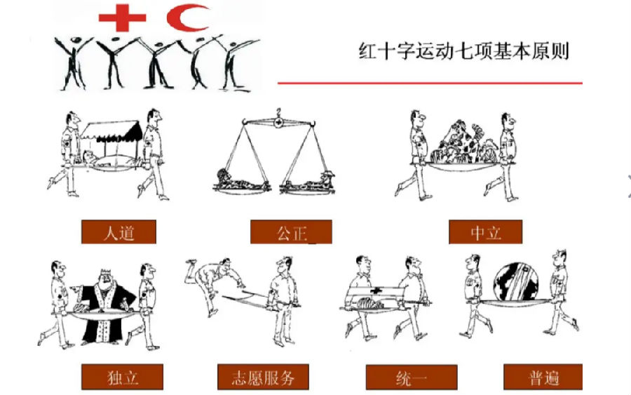 1.人道。国际红十字与红新月运动的本意是不加歧视地救护战地伤员。在国际和国内两方面,努力防止并减轻人们的疾苦,不论这种疾苦发生在什么地方。本运动的宗旨是保护人的生命和健康;保障人类尊严;促进人与人之间的相互了解、友谊与合作,促进持久和平。