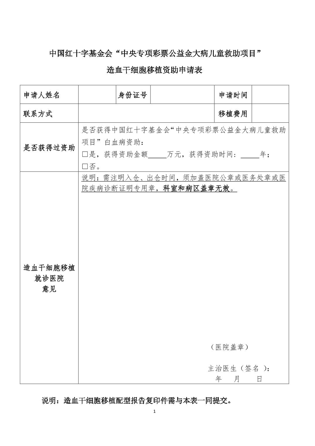2、+《中国红十字基金会“中央专项彩票公益金大病儿童救助项目”造血干细胞移植资助申请表》+(限白血病儿童移植出仓后申请补充资助填写).pdf